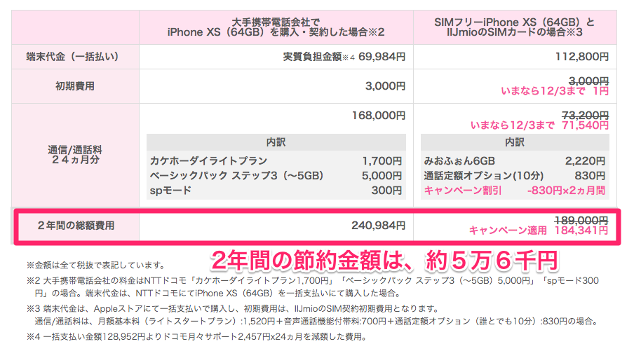 最新のiPhone Xsをキャリア契約した場合と、IIJmioで運用した場合の比較