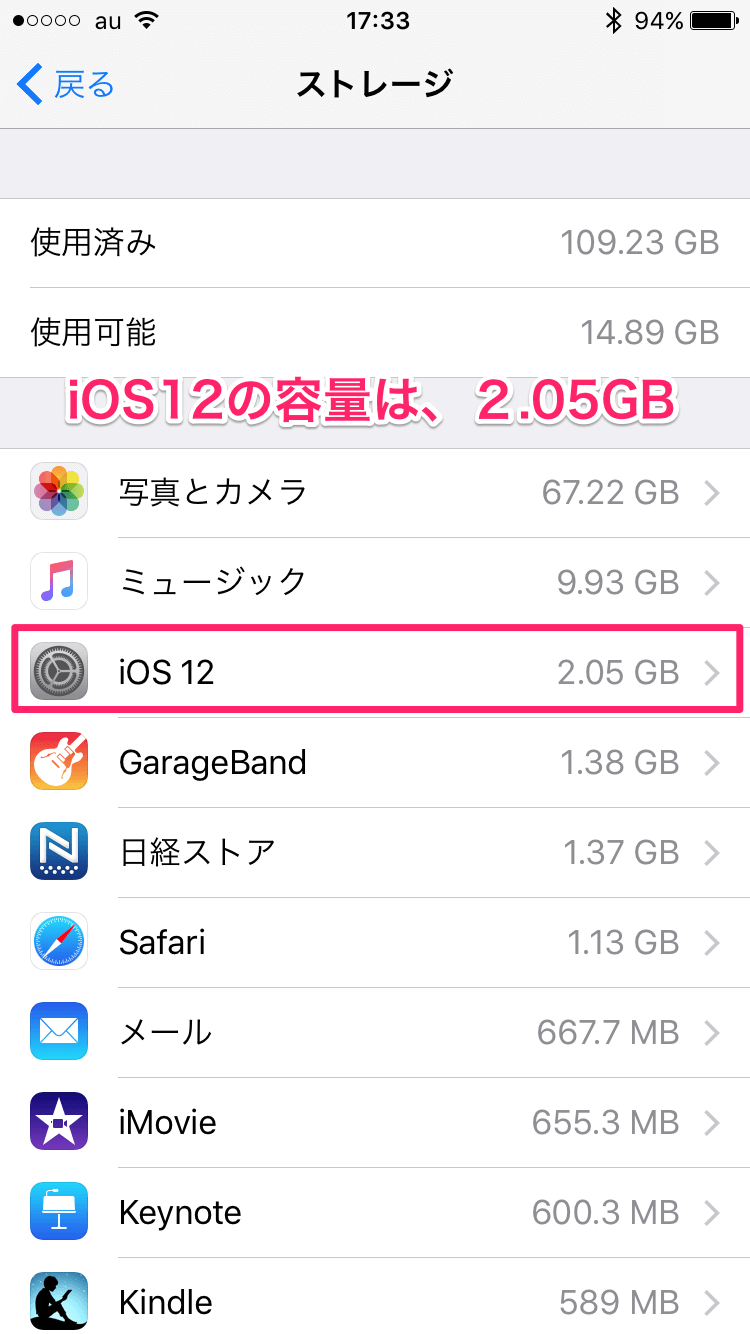 ちなみに最新のiOS、 iOS12のサイズは2.05GBでかなり大きいです。